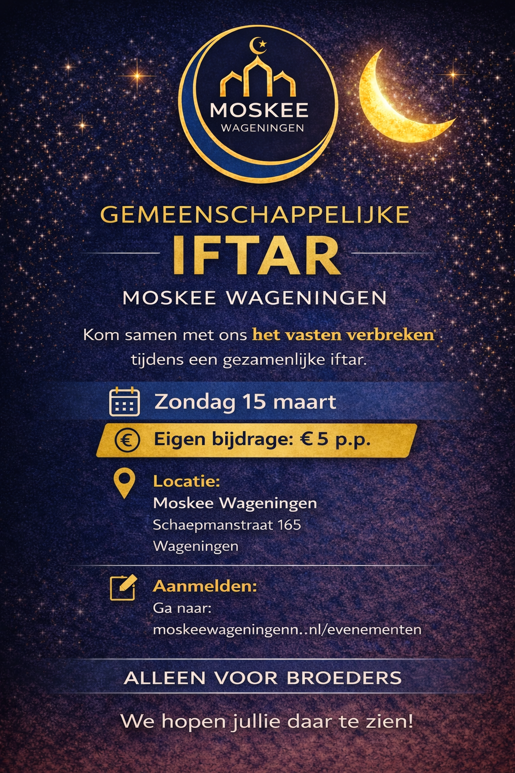 Op zondag 15 maart organiseert Moskee Wageningen in shaa Allaah een iftar voor broeders. Iedereen is van harte welkom. Reserveren is verplicht via onderstaande knop. De eigen bijdrage bedraagt 5 euro.