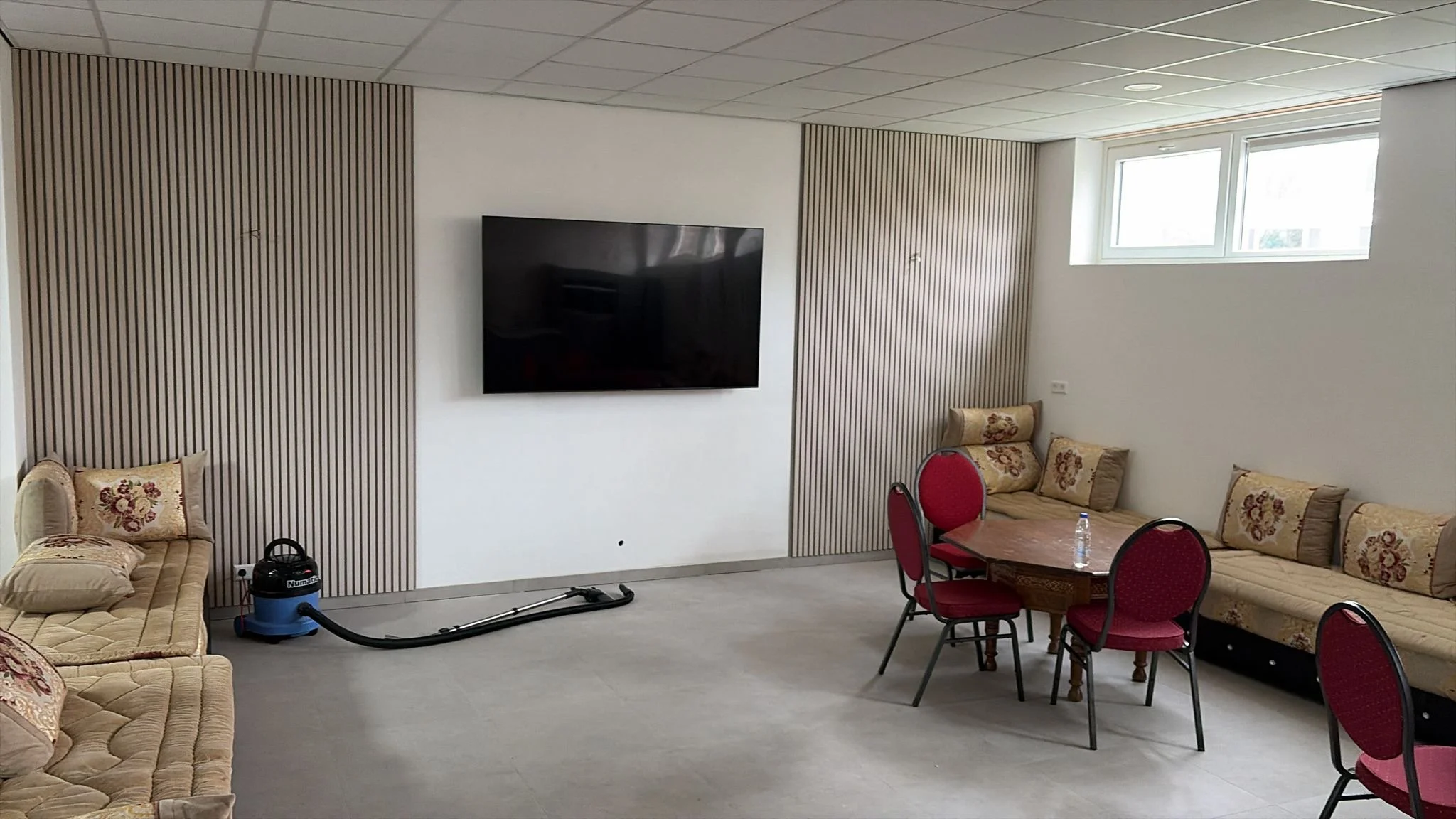 De bouw van de nieuwe wasruimte en ruimte om samen te komen is in de laatste fase beland. Hieronder is de nieuwe ruimte te zien waarin broeders samen komen bij een gelegenheid, een vergadering of gezellig onder genot van een kop koffie bij te praten. De ruimte is voorzien van een keuken en is tijdelijk voorzien van bestaande meubels.